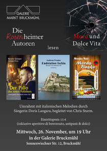 Kerstin Groeper, Andreas Franke und Monika Nebl von der Gruppe „Die Rosenheimer Autoren“ lassen die Zuhörer in die spannenden Fälle ihrer drei unterschiedlichen Ermittler eintauchen. Sängerin Doris Langara sorgt mit Chris Sturm am Klavier für weiteres mediterranes Flair.